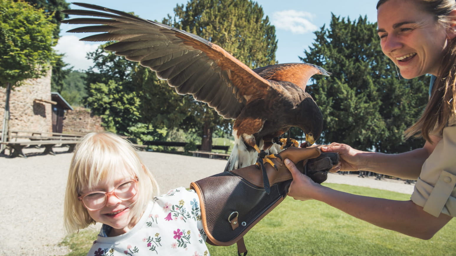 Lassen Sie sich in der Volerie des Aigles in den Ruinen einer denkmalgeschützten mittelalterlichen Burg die erstaunlichsten Greifvögel der Welt näher bringen und zähmen!