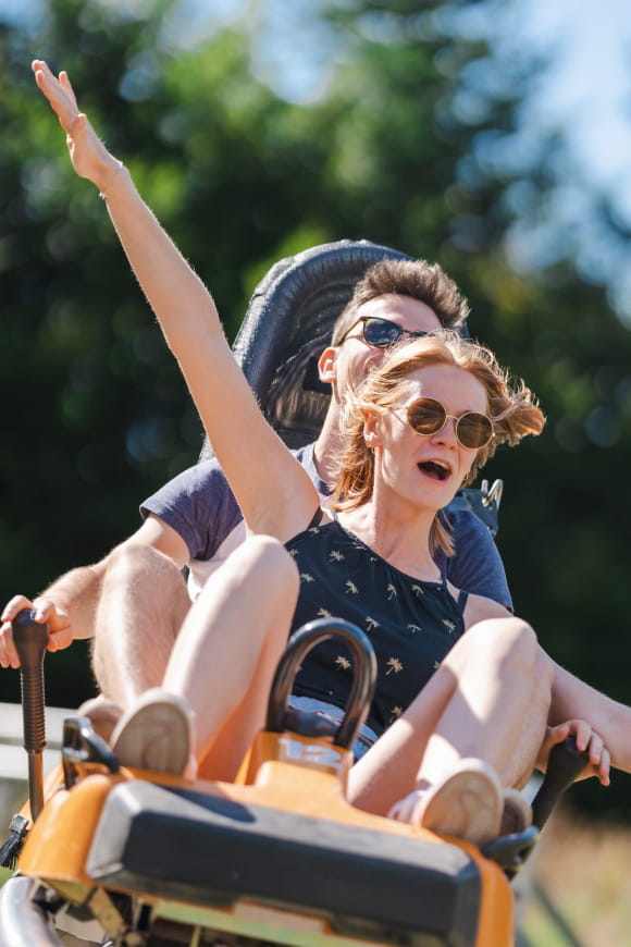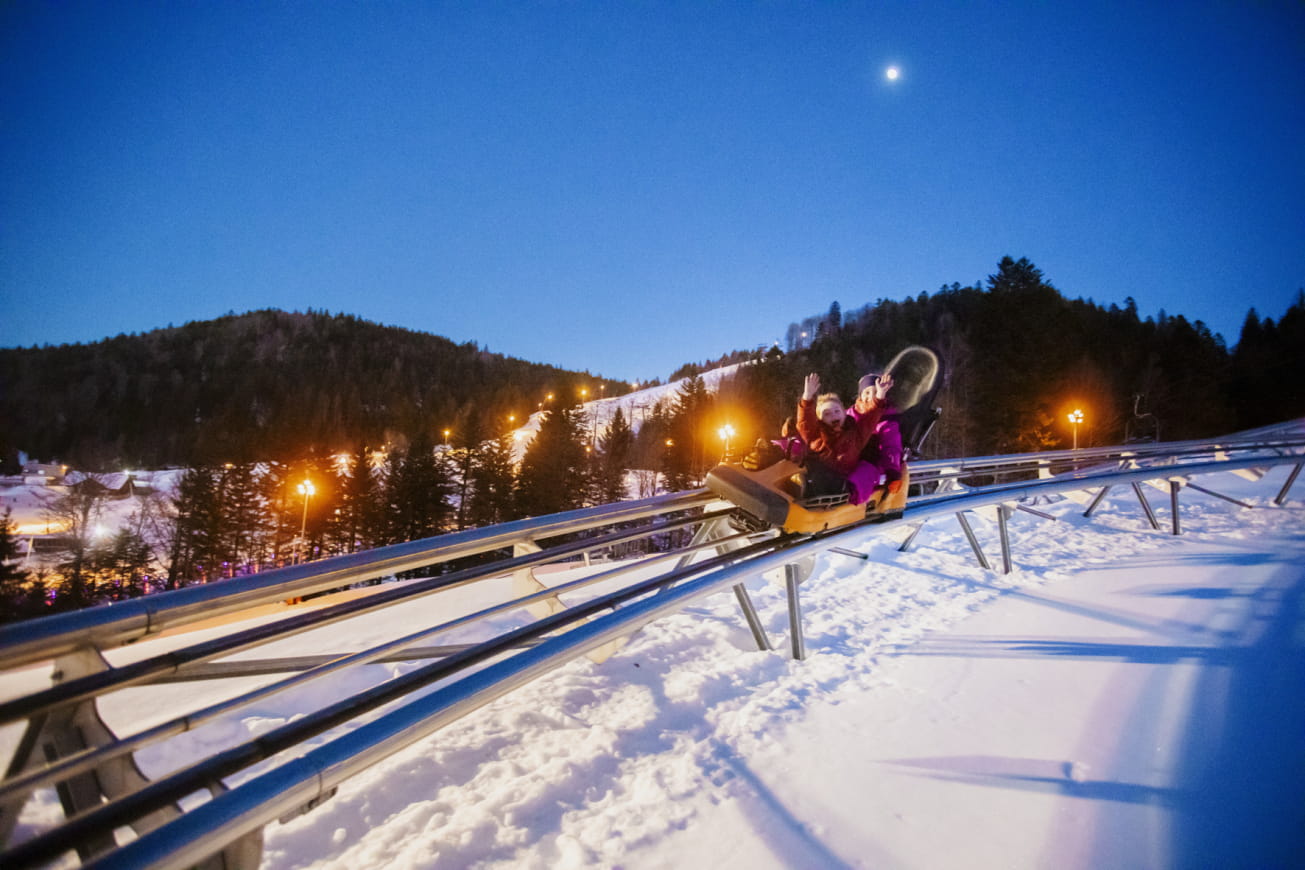 Eine außergewöhnliche Aktivität erwartet Sie und lädt Sie dazu ein, zu zweit oder allein neue Eindrücke zu sammeln! Genießen Sie unbegrenzte Abfahrten mit dem Schienenschlitten auf einem 900 m langen Rundkurs, der durch Steilkurven, Wellen und eine 340°-Drehung führt.