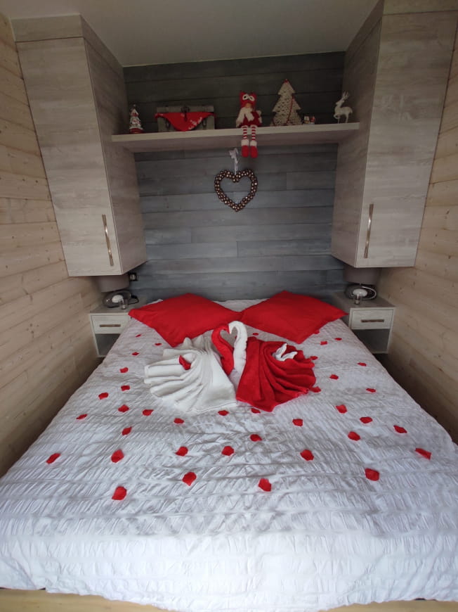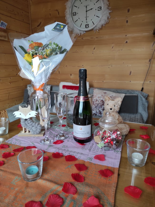 Wenn Sie sich für dieses Angebot für 2 Übernachtungen für 2 Personen entscheiden, genießen Sie den Komfort eines atypischen, unabhängigen und sorgfältig eingerichteten Chalets, in dem Sie von einer gemütlichen Einrichtung profitieren, die aus einem mit einem Schlafsofa ausgestatteten Wohnzimmer, einem intimen Schlafzimmer mit einem Kingsize-Bett 160×200 sowie einem Badezimmer mit einer italienischen Dusche besteht. Hinzu kommt ein privates und ganzjährig beheiztes Spa, in dem Sie sich entspannen können, sowie ein Romantikpaket mit Badewäsche + 1 ½ Flaschen Champagner, die Sie für Ihre Momente zu zweit genießen können.
