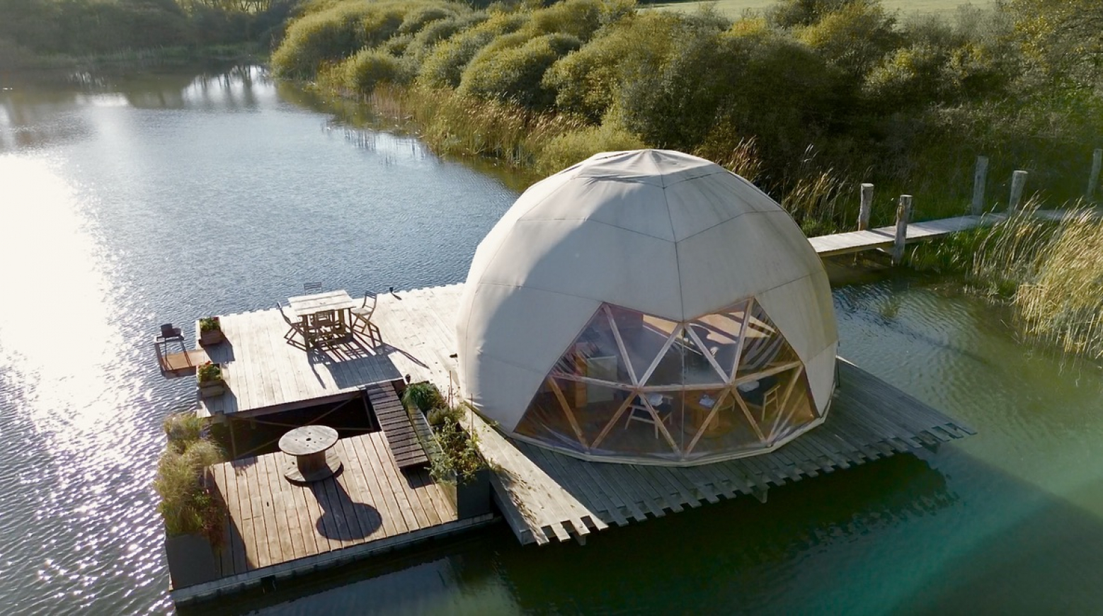 Im Inneren empfängt Sie Le Dôme in einem warmen Kokon mit einem ultrabequemen Kingsize-Bett, einer eleganten Dekoration für eine gemütliche Atmosphäre zu jeder Jahreszeit. Die große private Terrasse sowie die schwimmende Terrasse laden Sie dazu ein, ein Frühstück im Freien zu genießen oder einfach nur die Gelassenheit der Umgebung zu erleben. Die Trockentoilette und die Dusche in der Kuppel bieten einen unvergleichlichen Komfort.