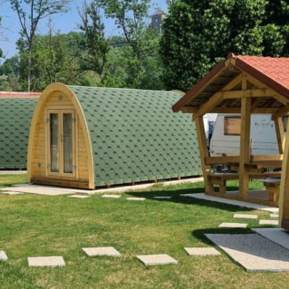 Lassen Sie sich von dieser ungewöhnlichen Unterkunft überraschen: einer POD-Hütte in Form eines halben Baumstamms, die auf dem Boden aufgestellt und aus natürlichen Bau- und Isoliermaterialien hergestellt wurde.