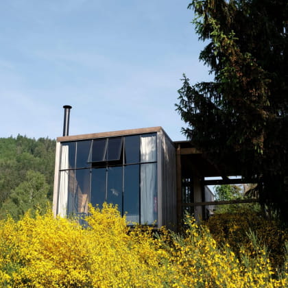 Von außen mag die Hütte beengt wirken, aber das ist nicht der Fall. Sie ist nämlich 34 m² groß und besteht aus zwei großen Glasdächern aus Stahl, die Ihnen viel Licht und einen schönen Blick auf die umliegende Natur bieten.