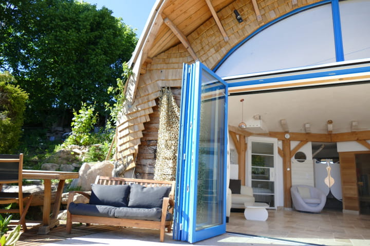 Im Inneren werden Sie von der Schönheit der vollständig faltbaren Glasfassade überwältigt sein. Dieses luxuriöse Ferienhaus verfügt über 2 Schlafzimmer mit Doppelbetten vom Typ “Boxspring” mit 4-Sterne-Komfort und ein Schlafzimmer, das von einer motorisierten Kuppel beleuchtet wird, die Ihnen süße Träume unter dem Sternenhimmel beschert.