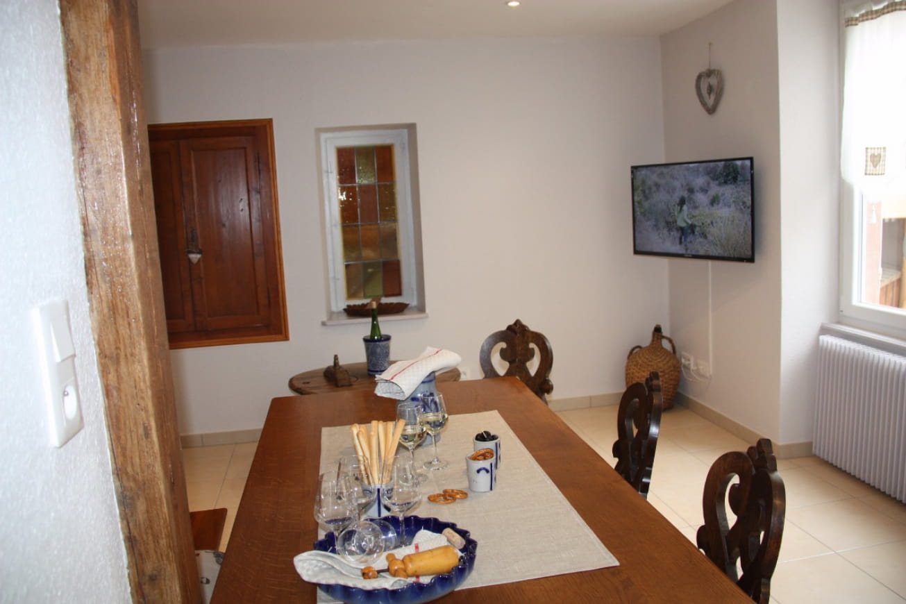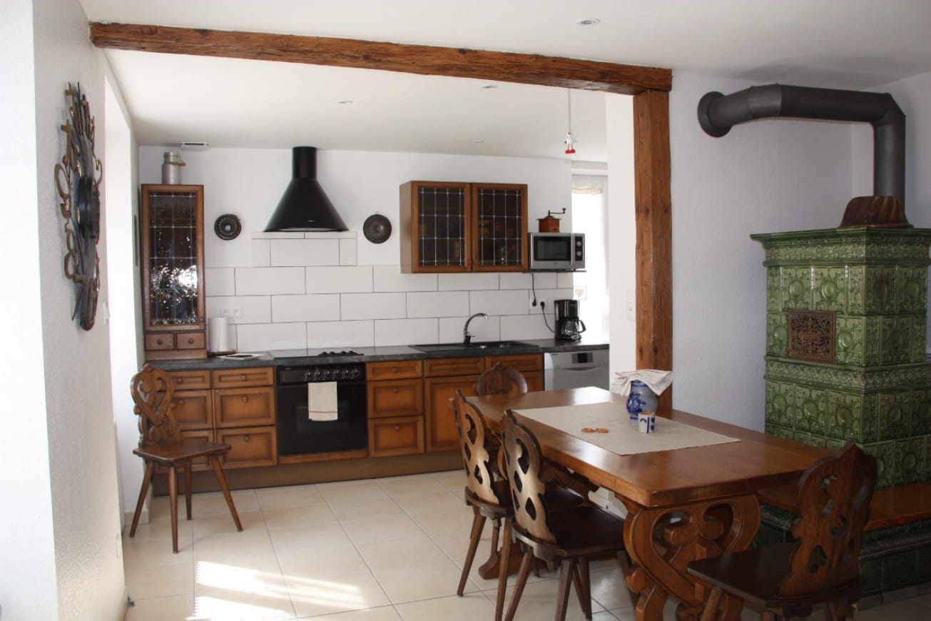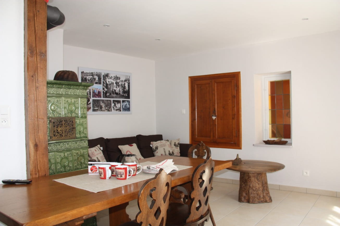 Alles ist für Ihren Komfort vorgesehen. Drei schöne Schlafzimmer (1 Bett 160×200, 1 Bett 140×200 und 2 Betten 90×190), ein großes Badezimmer mit Dusche, WC und Waschmaschine, ein separates WC sowie eine Küche, die sich zu einem hellen Wohnraum hin öffnet. Sie werden von dem antiken Kachelofen begeistert sein, um den man gerne die Winterabende verlängert!