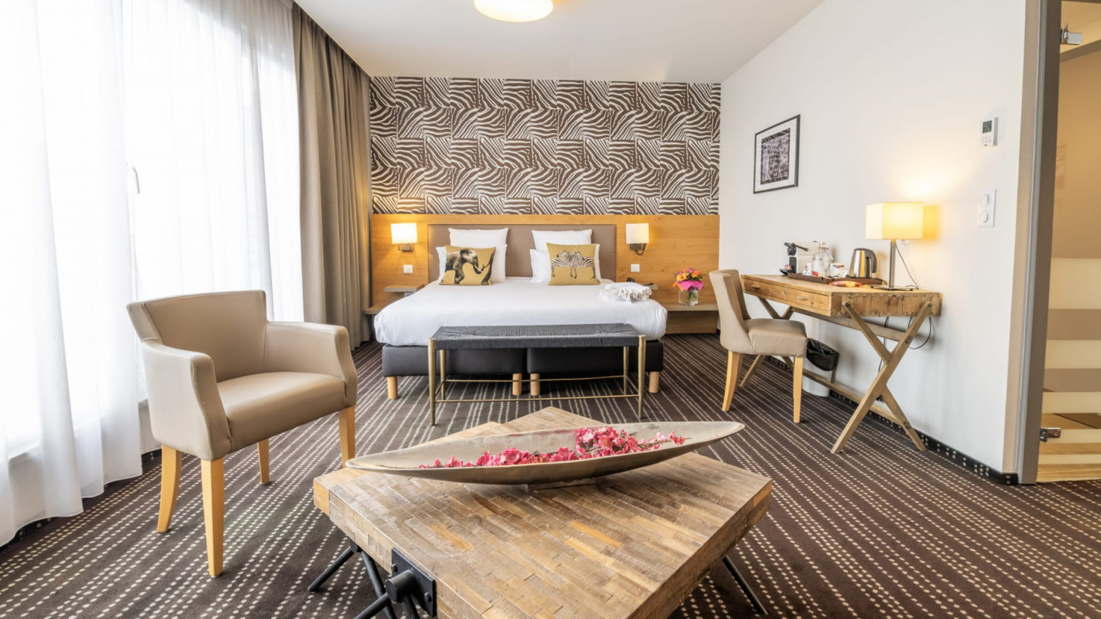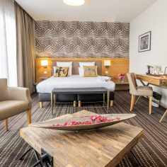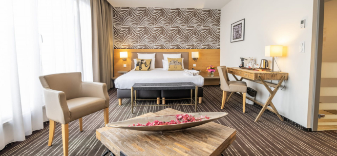 Diese Suiten sind 30 m² groß. Sie eignen sich perfekt für Paare, die während ihres Aufenthalts mehr Wohnraum mit Wohnzimmer, Büro und Schlafmöglichkeiten haben möchten. Sie verfügen über eine mehrstrahlige Whirlpool-Badewanne und eine Terrasse mit Gartenmöbeln, auf der Sie sich nach einem Tag voller Entdeckungen und guter Tipps in Straßburg entspannen können.