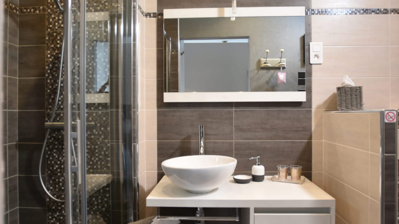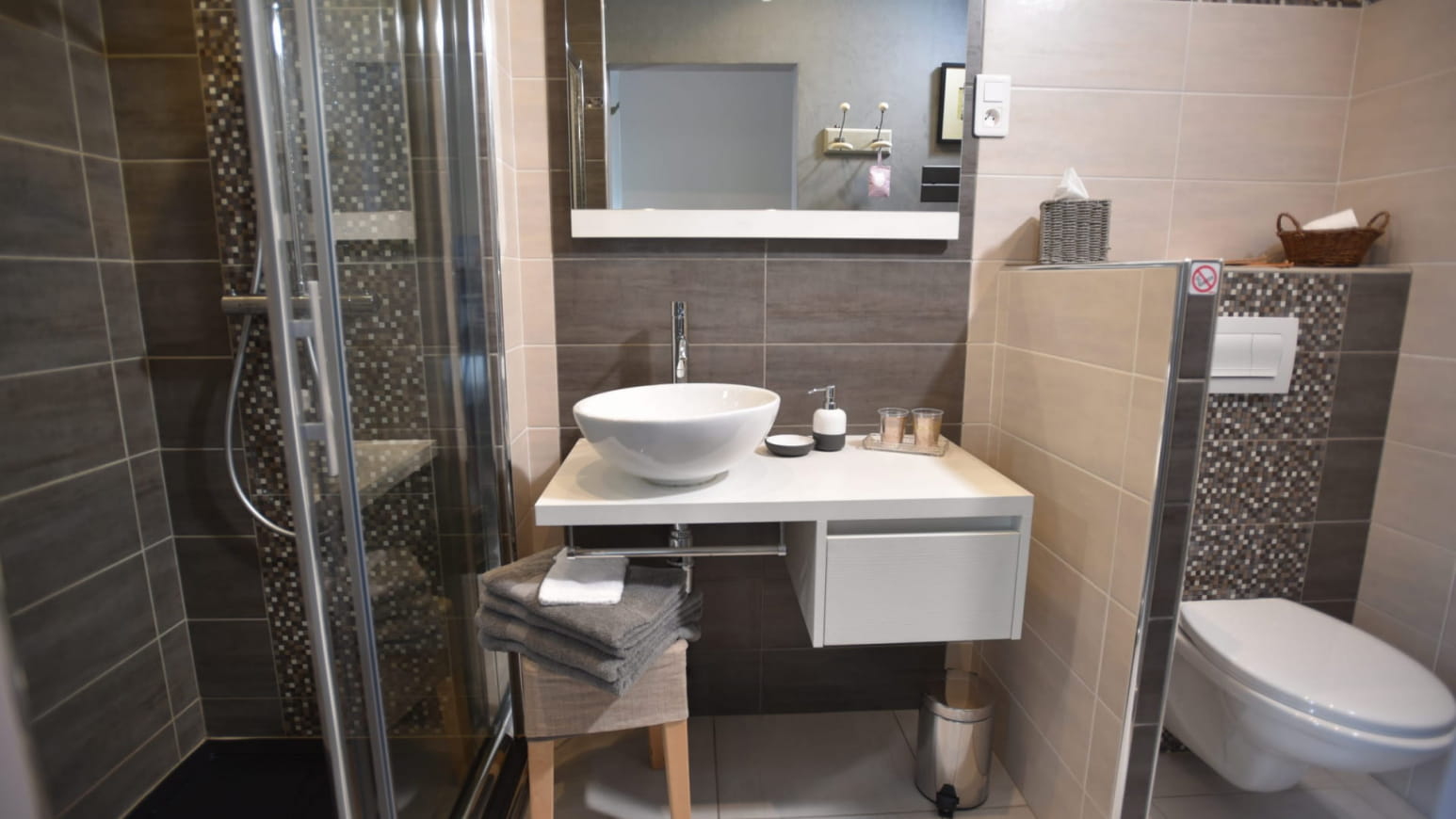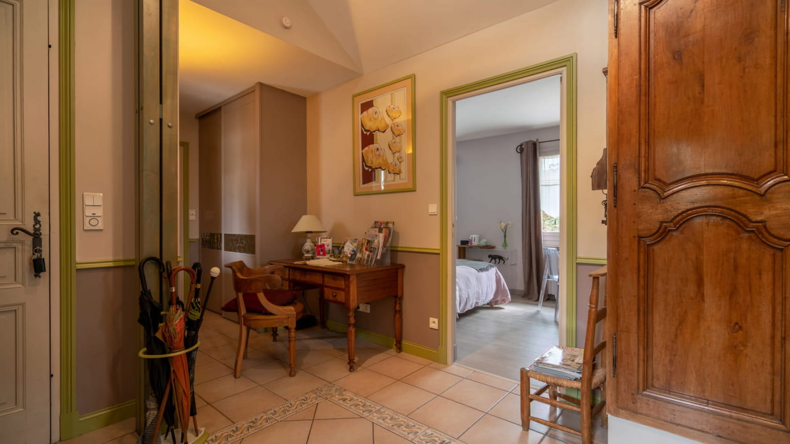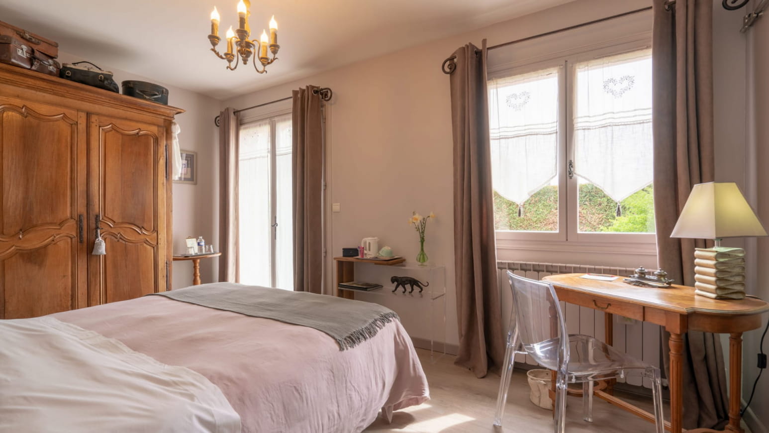 Das 14 m² große, separate Zimmer im Gartengeschoss öffnet sich auf eine private Holzterrasse, die durch einen kleinen, angelegten Garten verlängert wird. Hier finden Sie einen Tisch, Liegestühle und einen Sonnenschirm, um die schönen Tage in absoluter Privatsphäre zu genießen. Das gemütliche und helle Innere bietet ein Kingsize-Bett, ein modernes Badezimmer mit geräumiger Dusche und Toilette sowie einen Bürobereich, der sich ideal für einen beruflichen Aufenthalt eignet. In der Saison profitieren Sie außerdem vom Zugang zu einem beheizten Außenpool, den Sie sich mit den Eigentümern teilen, für einen erfrischenden und entspannenden Moment nach Ihren Spaziergängen.