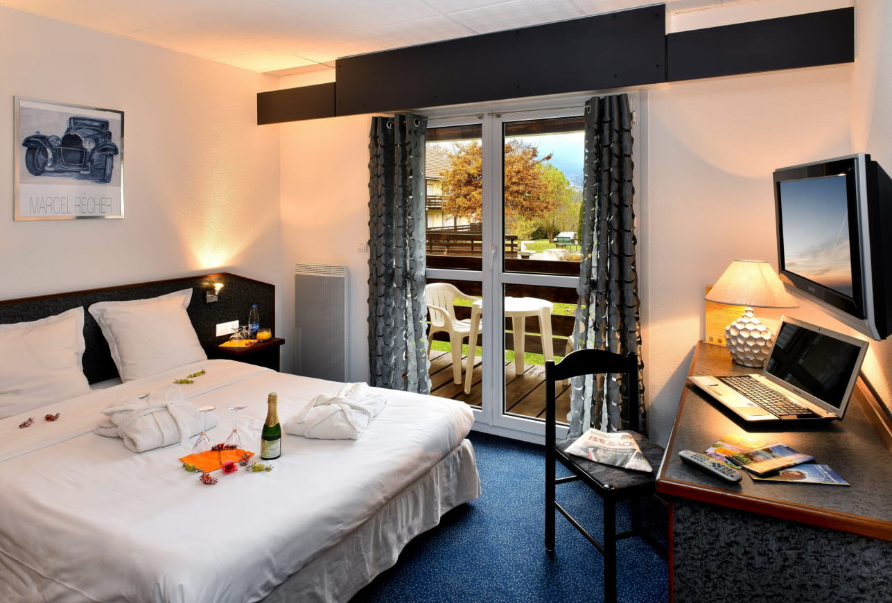 Für eine Übernachtung zu zweit im Elsass bietet Ihnen das Vallée Noble*** seine charmanten klassischen Doppelzimmer, die Sie in einer gemütlichen Umgebung empfangen, die ideal für einen Aufenthalt zu zweit ist. Die schlichte und romantische Einrichtung lädt dazu ein, die Flamme neu zu entfachen. Außerdem verfügt jedes Zimmer über einen überdachten Balkon mit Blick auf den Wald. Sie können sich in der kleinen Lounge im Freien niederlassen und das Panorama bewundern, während Sie Ihr Glas Crémant trinken. Oder begeben Sie sich ins Restaurant, um die Spezialitäten des Küchenchefs bei einem Abendessen zu probieren.