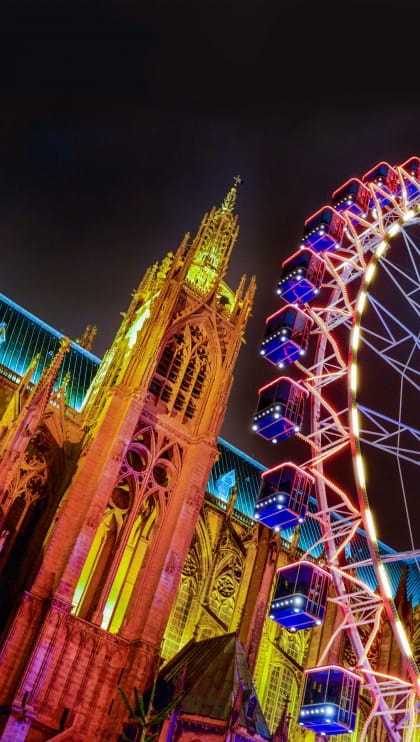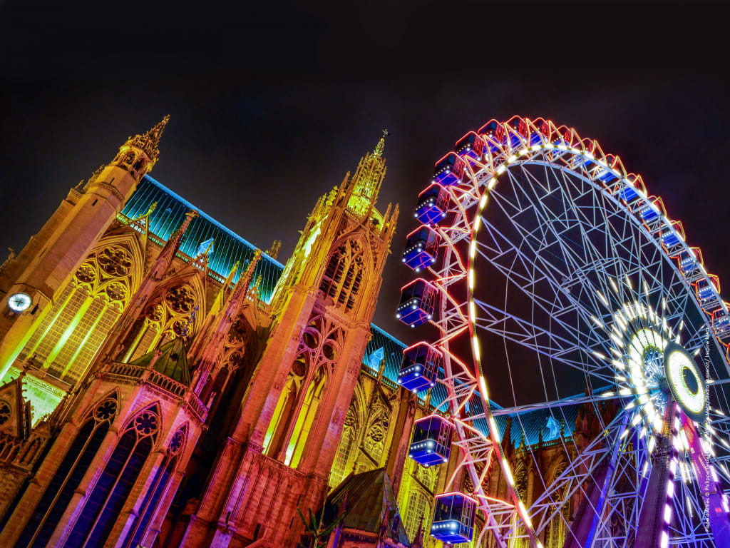 Heben Sie ab am Platz Place d’Armes! Am Fuße der strahlenden Kathedrale Saint-Etienne dreht sich das Riesenrad und verspricht einen traumhaften Blick auf die Stadt. Das Schauspiel ist zauberhaft.