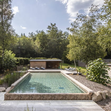 The domain is equipped with private spas, a pond, a swimming pool and a sauna.