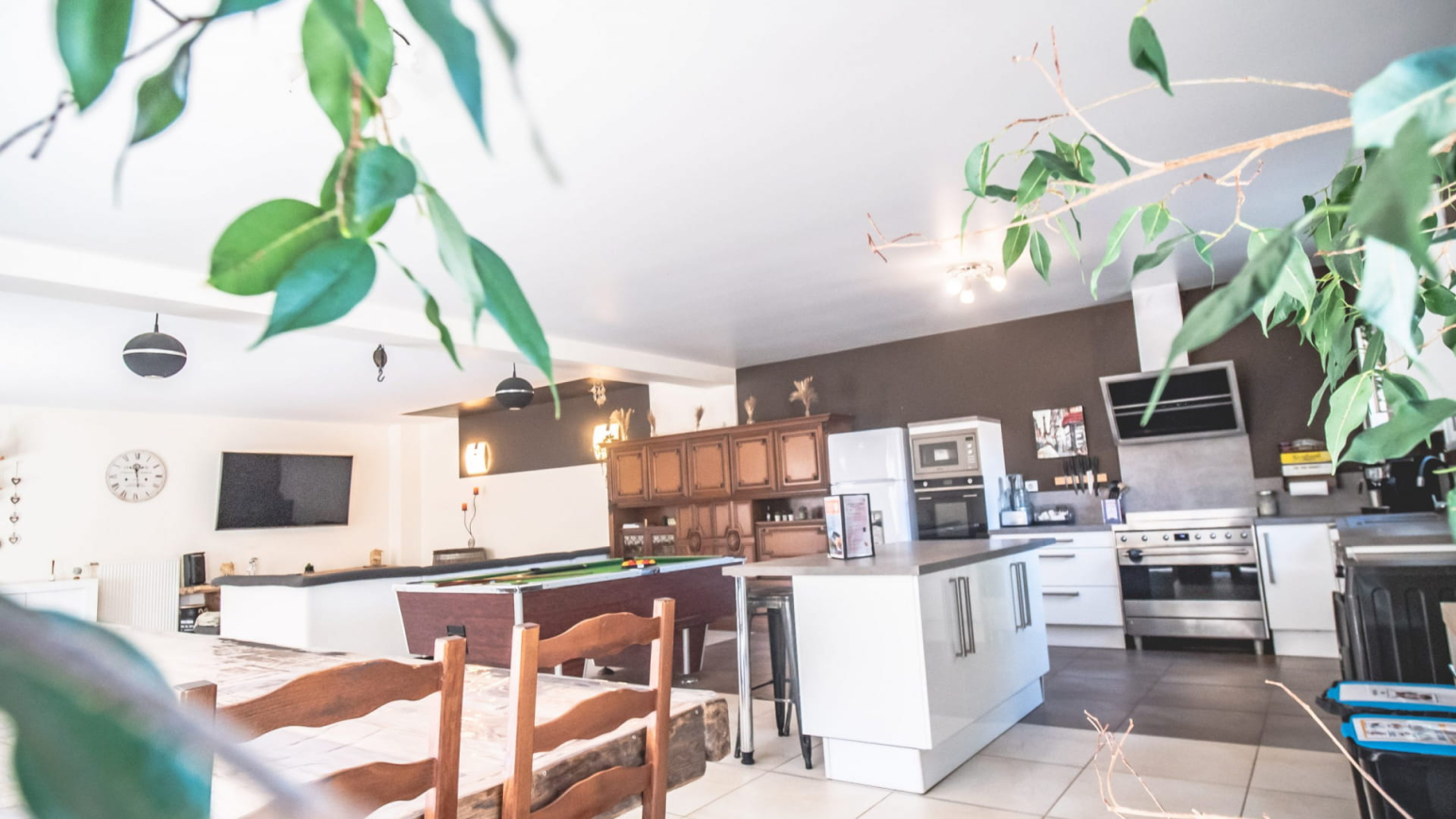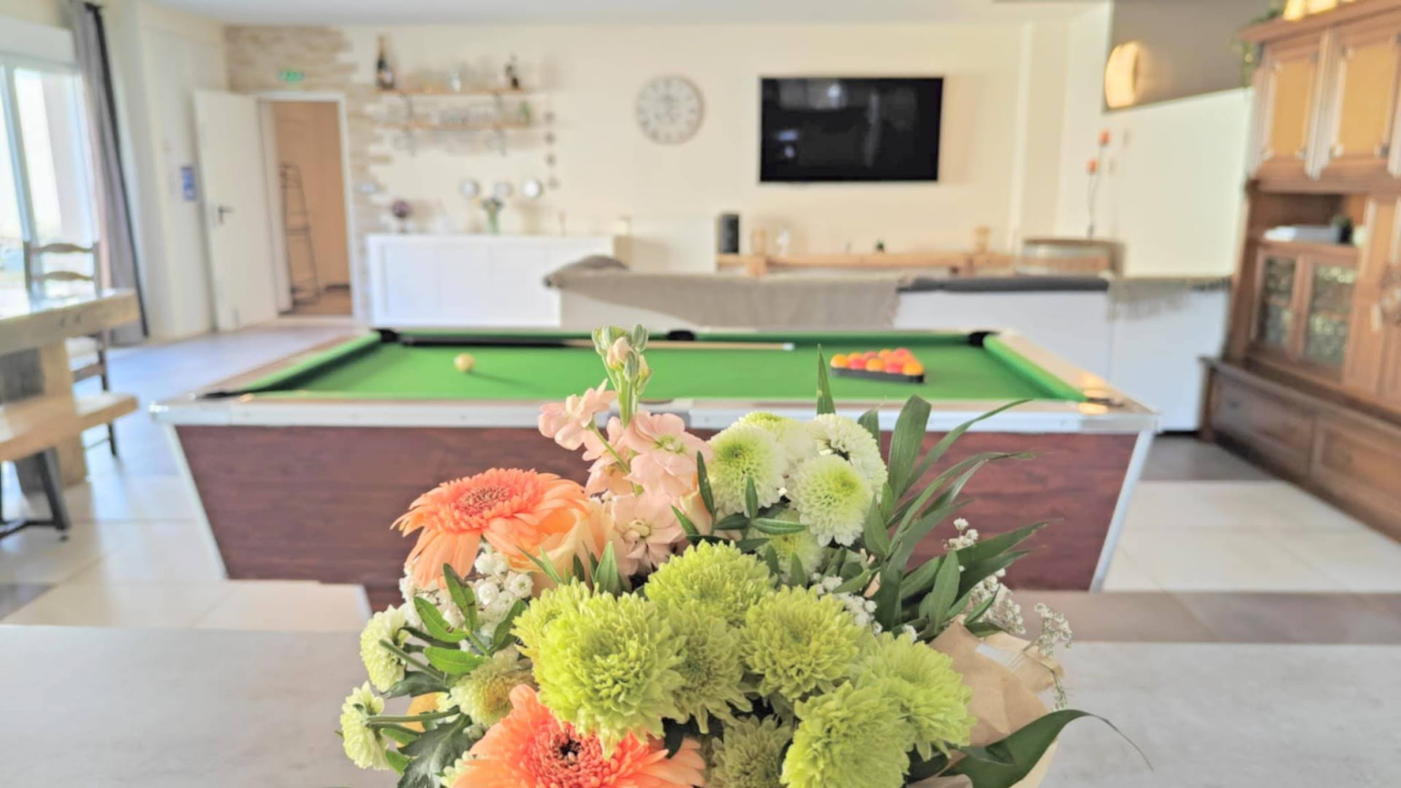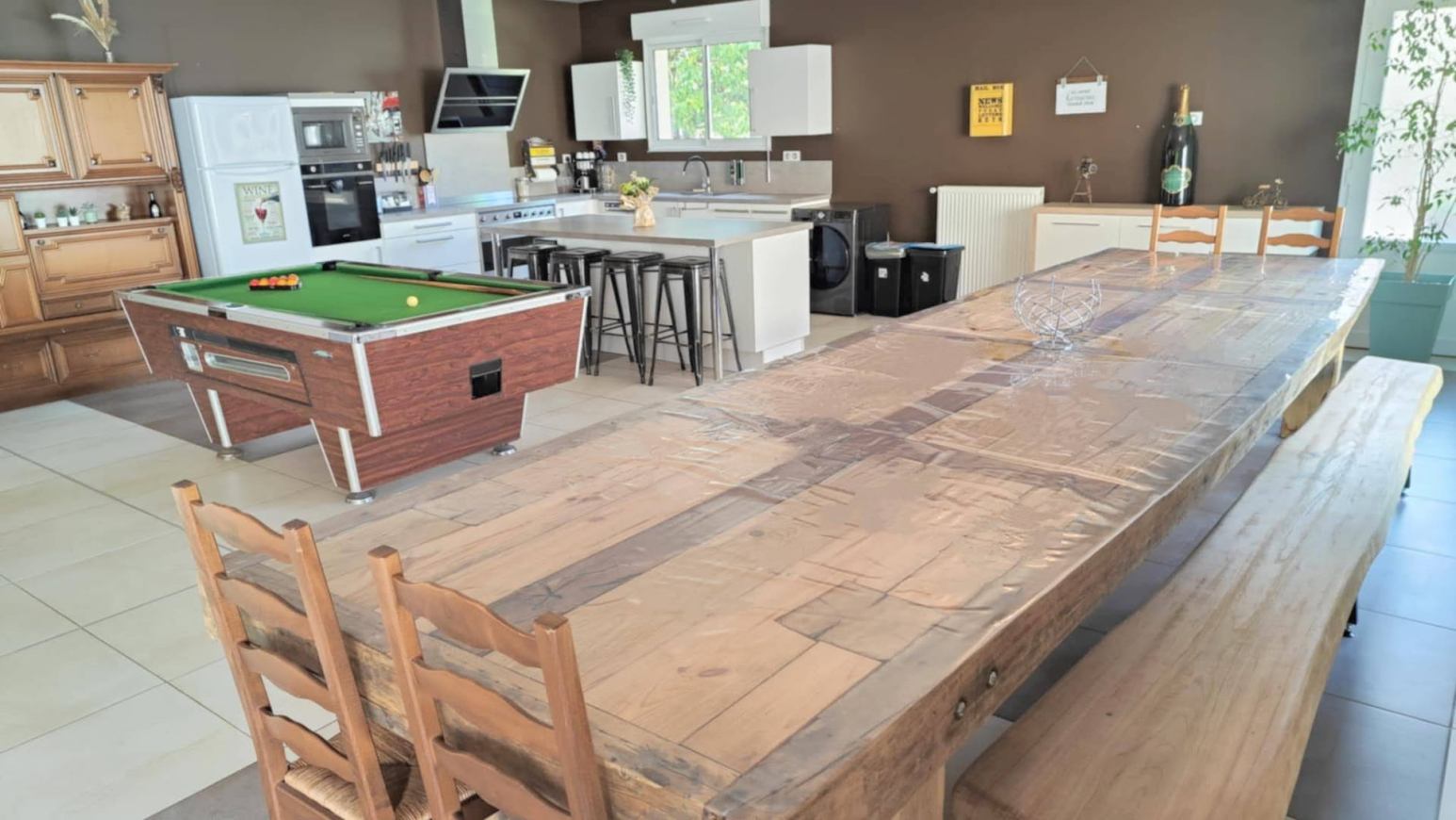 With its generous volumes, this gîte combines modern comfort with a warm atmosphere. It offers 3 bedrooms with King Size and Twin beds, a vast living room with XXL sofa, a large 5-meter family table and a fully equipped kitchen. Board games, billiards, Wi-Fi, television… everything here has been designed for a pleasant stay in all seasons.