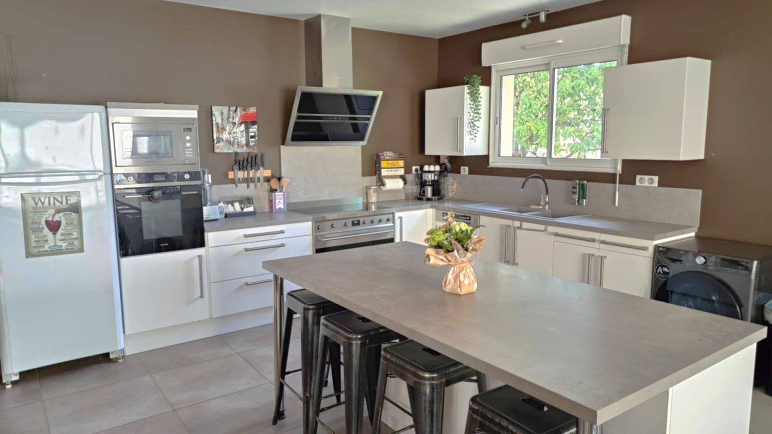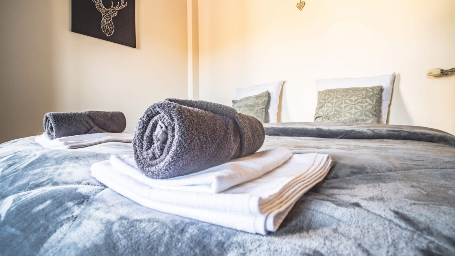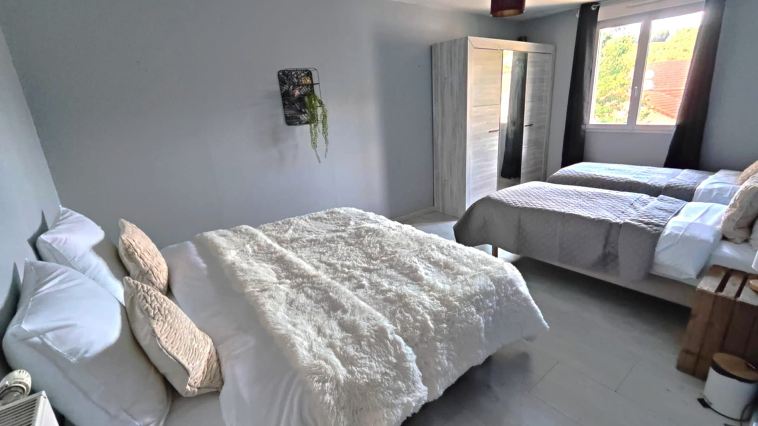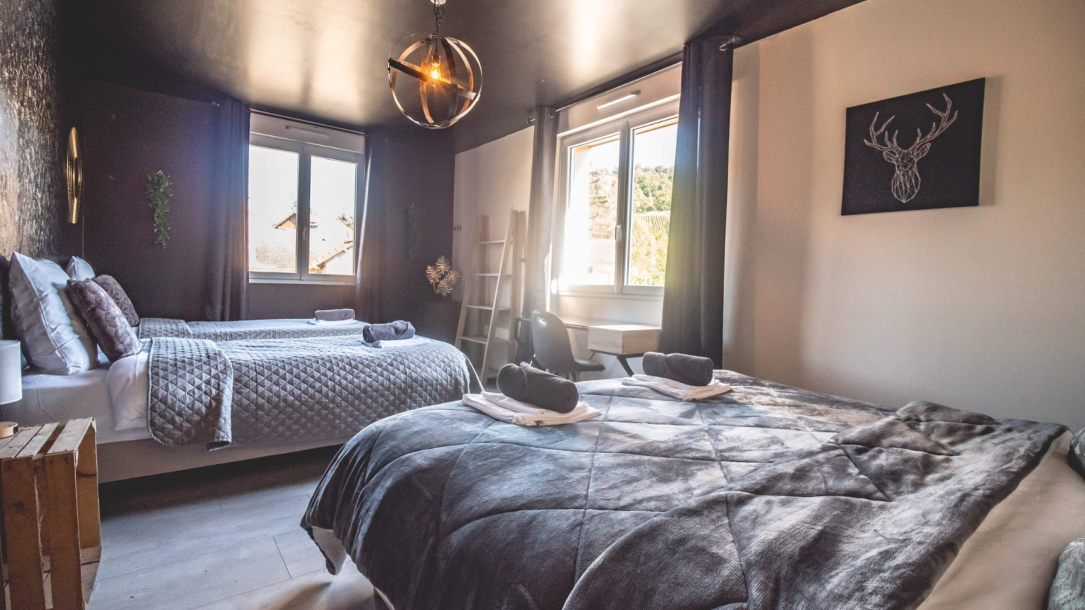 With its generous volumes, this gîte combines modern comfort with a warm atmosphere. It offers 3 bedrooms with King Size and Twin beds, a vast living room with XXL sofa, a large 5-meter family table and a fully equipped kitchen. Board games, billiards, Wi-Fi, television… everything here has been designed for a pleasant stay in all seasons.