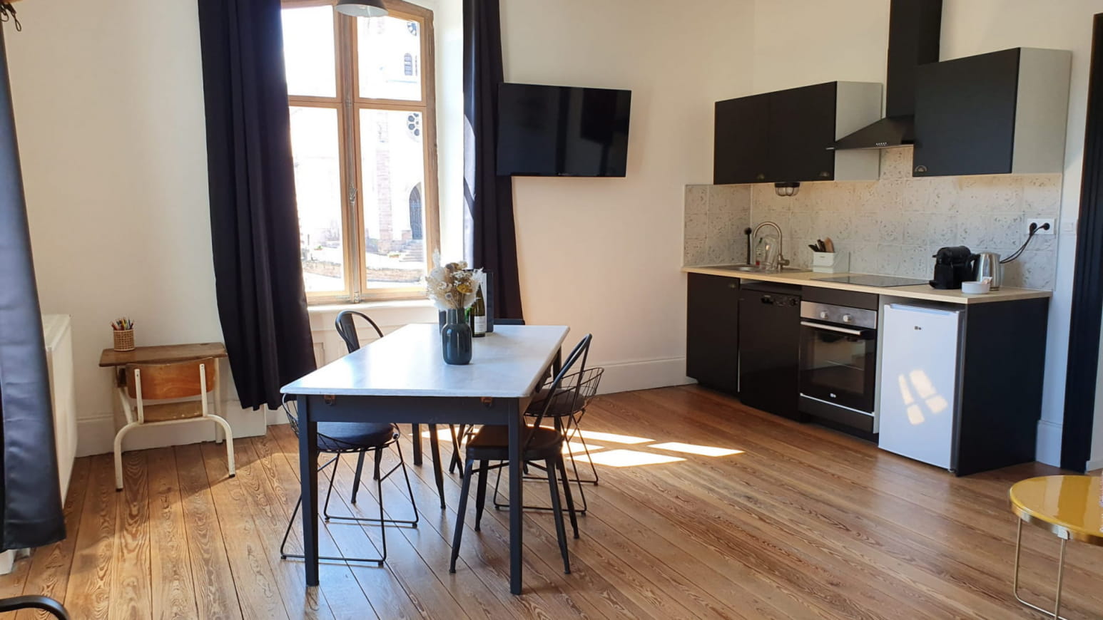 Guest apartments on the Alsace wine route. Five renovated apartments in a maison de maitre, plus a large guinguette/games room with second-hand goods area, table soccer and pétanque court in the building's wine cellar.