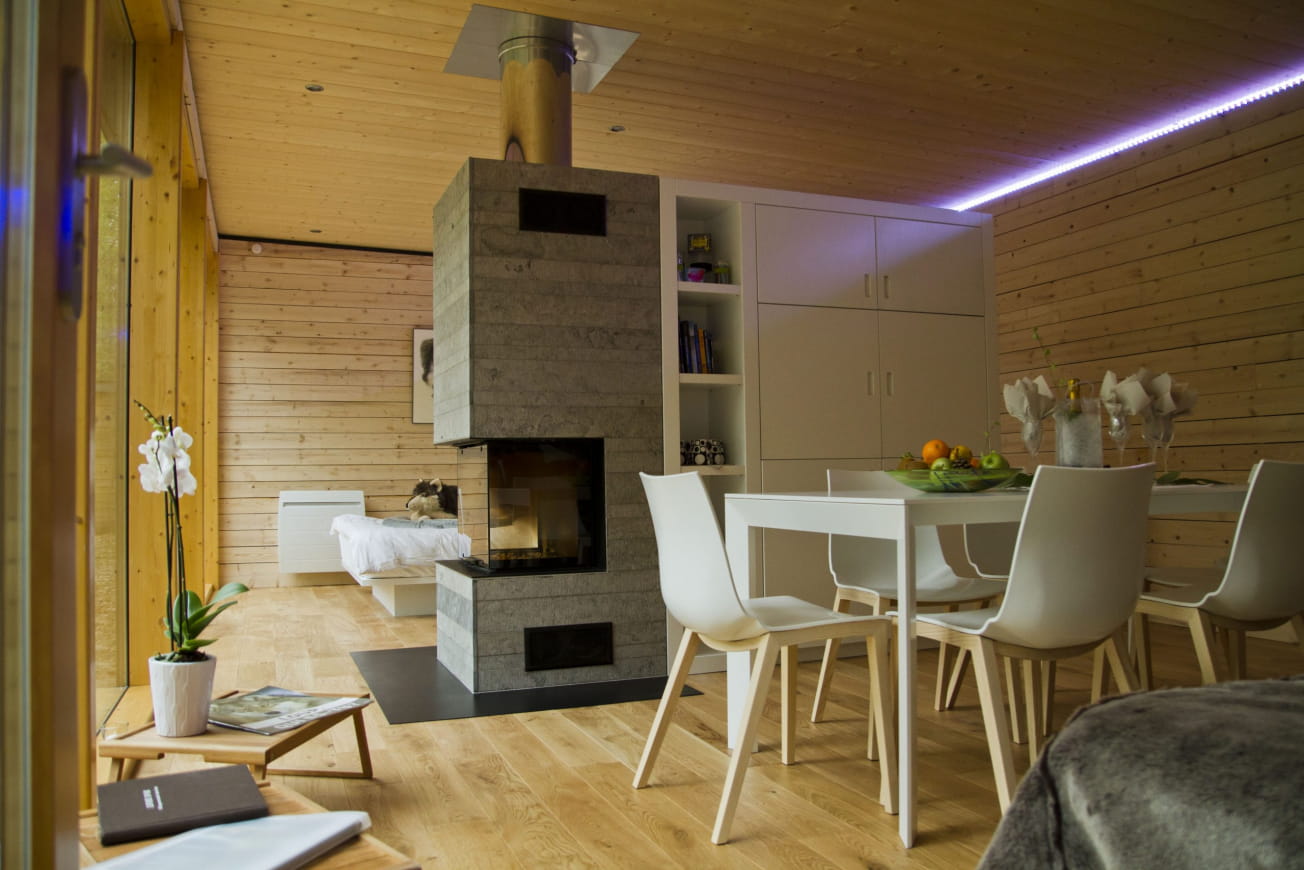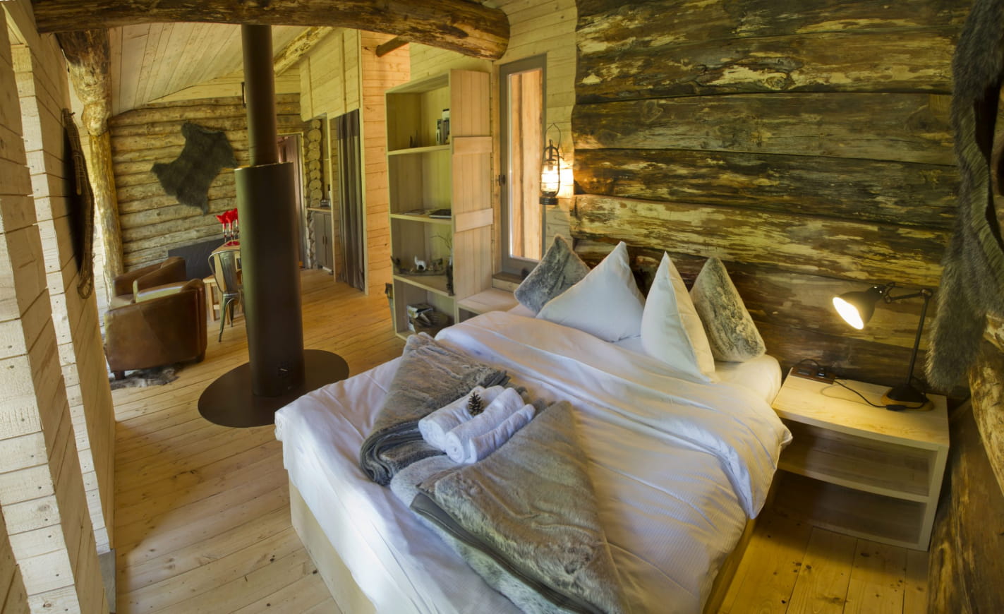 The spacious and welcoming Trapper’s Cabin (65m²) offers a magical tête-à-tête with the Arctic white wolves. It can accommodate up to 6 people and is equipped with a wood-burning stove for cocooning evenings.