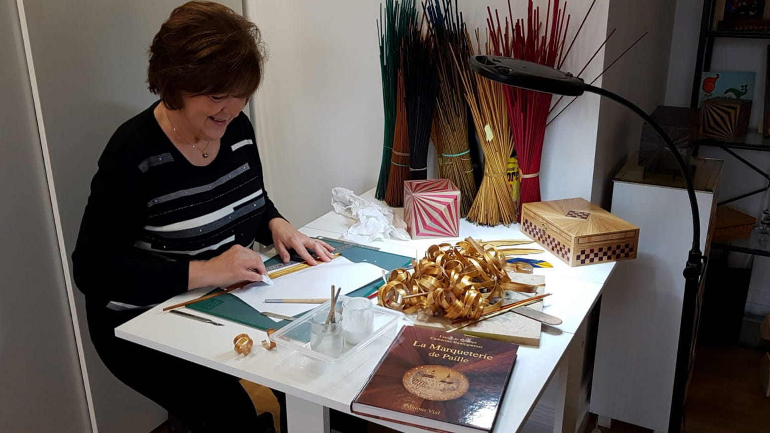 Immerse yourself in the enchanting world of straw marquetry with Michèle, a passionate artist for many years, during an introductory course in straw marquetry at her « Reflet de Paille » workshop. Let yourself be seduced by the play of light and the fascinating reflections of this exceptional craft.