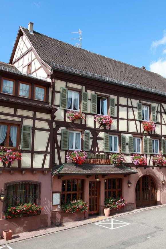 In the heart of the Alsatian vineyards, at the foot of Haut Koenigsbourg, in the small town of Saint Hippolyte, our beautiful half-timbered house will delight you. For 3 generations, our family has been delighted to welcome you to our Hotel-Restaurant-Logis.
