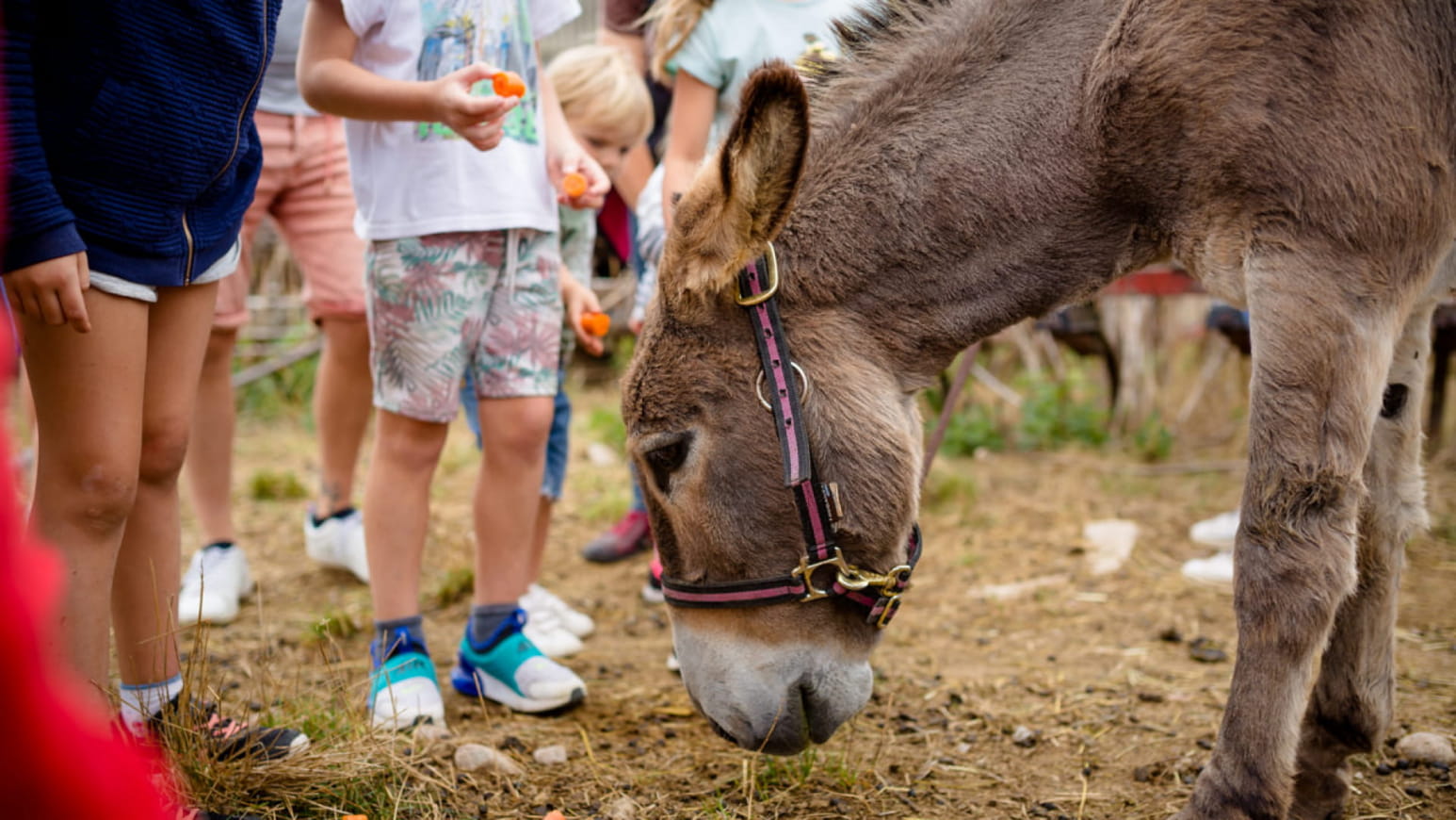 Invitate il vostro bambino a scoprire gli animali fin da piccolo! Che sia la prima volta o meno, ameranno incontrarli, toccarli e scoprire come vivono nella fattoria. Durante la visita guidata, potranno accarezzare il pelo di animali come conigli, asini, agnelli e pecore. Potranno anche provare attività agricole come toccare la paglia e i semi, preparare il mangime per le galline, dare da mangiare le carote all'asino Maturin e guidare un trattore.