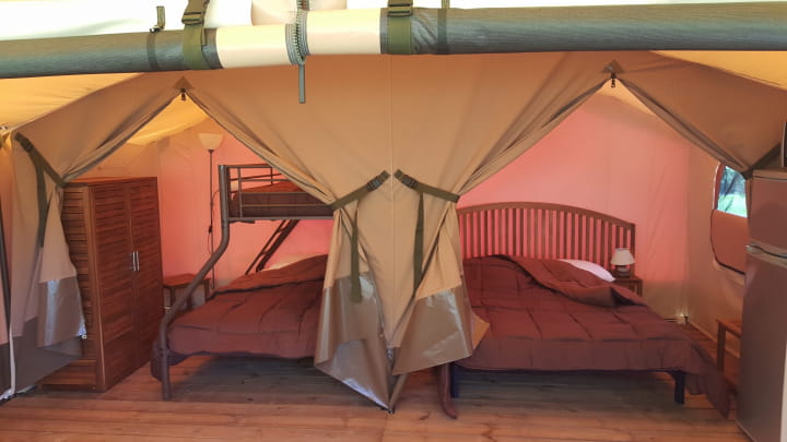 - Hébergement en dur mais qui garde l’esprit camping grâce à sa toile
