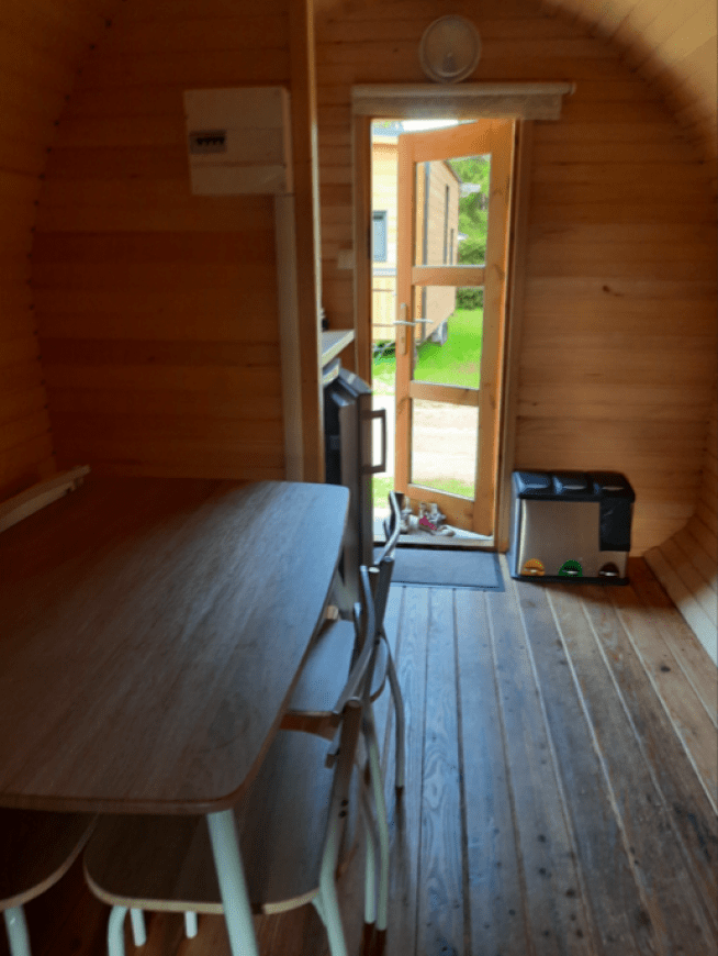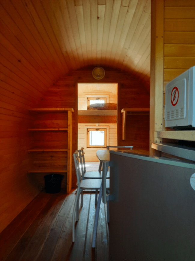 Sebbene la botte sia dotata di un angolo cottura completamente attrezzato, non dispone di acqua, quindi non c’è un bagno o un WC. I servizi igienici del campeggio si trovano a soli 30 metri di distanza. Su un lato c’è una terrazza per godersi l’aria aperta. Il parcheggio è disponibile accanto al campeggio.