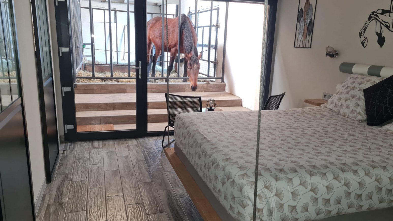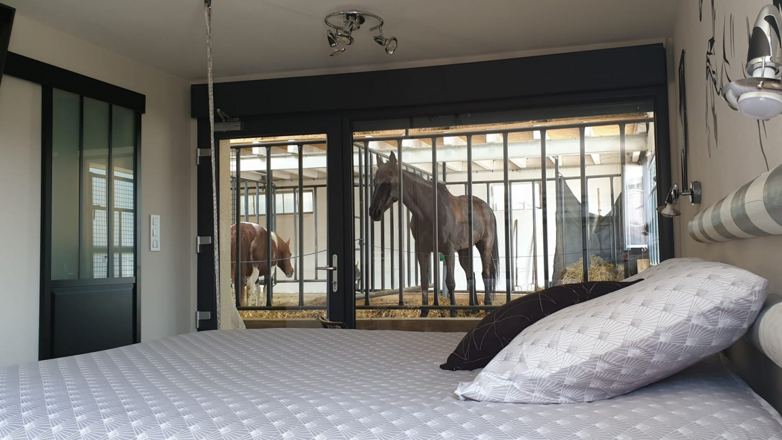 Con 5 camere classificate 4 épis, godrete dell’insolito, della tranquillità e del comfort! Ognuna di queste camere, di 28 m², è un’oasi di pace, con il vantaggio di poter vedere da vicino i cavalli attraverso una grande finestra panoramica!