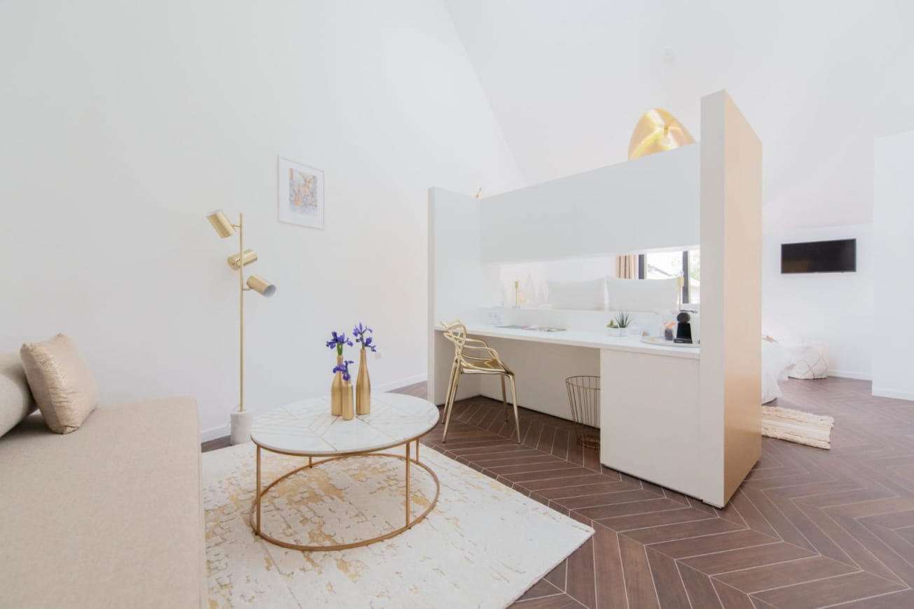 De vijf suites, met een chique en eigentijdse inrichting, zijn allemaal uniek en beschikken elk over een ruime ruimte en uitzicht op de tuin.