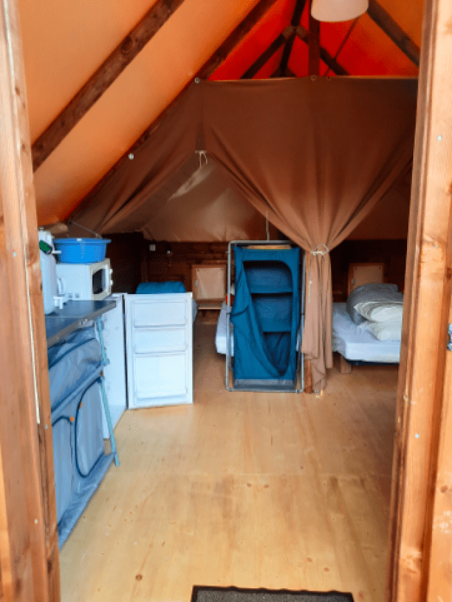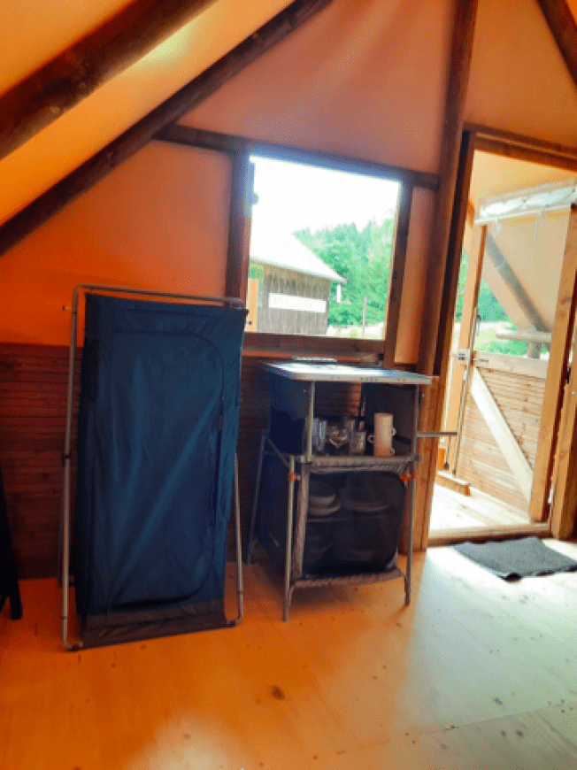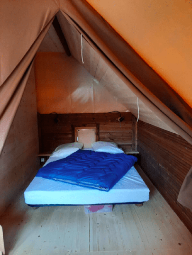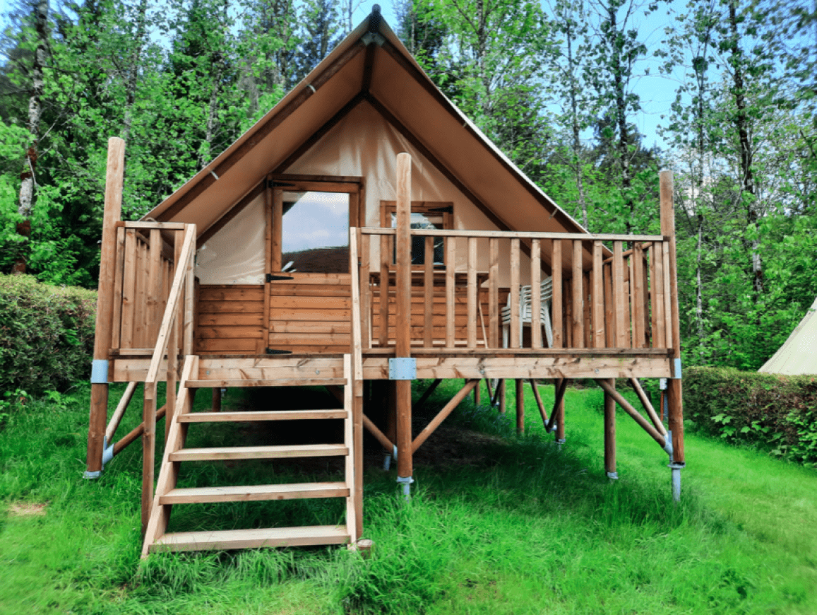 Voor dit arrangement verblijf je in de Cabane Amazone, een paalwoning voor 4 personen. Het heeft een slaapkamer met een tweepersoonsbed van 140×190 cm en een andere slaapkamer met 2 eenpersoonsbedden van 70×190 cm. Deze hut is uitgerust met een kitchenette en alles wat je nodig hebt voor een aangenaam verblijf, maar heeft geen stromend water, badkamer of toilet. De toiletten van de camping bevinden zich op ongeveer vijftig meter afstand.