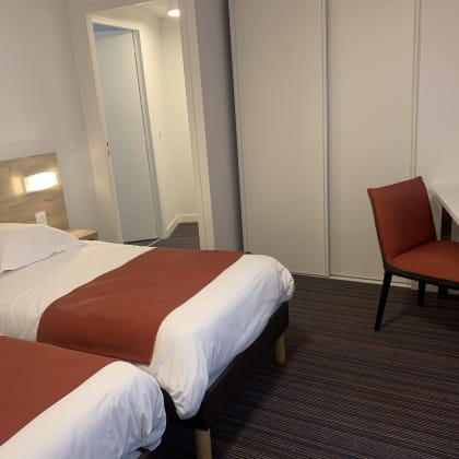 Ons hotel is in 2019 volledig gerenoveerd en beschikt over 60 kamers met één verdieping en een prachtige duplex van 66 m². Deze laatste zal u charmeren met zijn uitzonderlijke natuurlijke omgeving, met uitzicht op ons uitgestrekte park van 2,5 hectare en zijn prachtige tuin. Geniet van het panoramische uitzicht vanaf het kleine terras van deze charmante duplex!