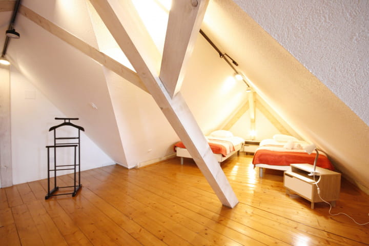 De slaapkamers verwelkomen je in een geraffineerde omgeving die bijzonder geschikt is om te ontspannen. De eerste heeft een tweepersoonsbed en geeft uit op een serene binnenplaats. De tweede, op zolder, heeft 2 eenpersoonsbedden en airconditioning voor een rustige nachtrust in elk seizoen.
