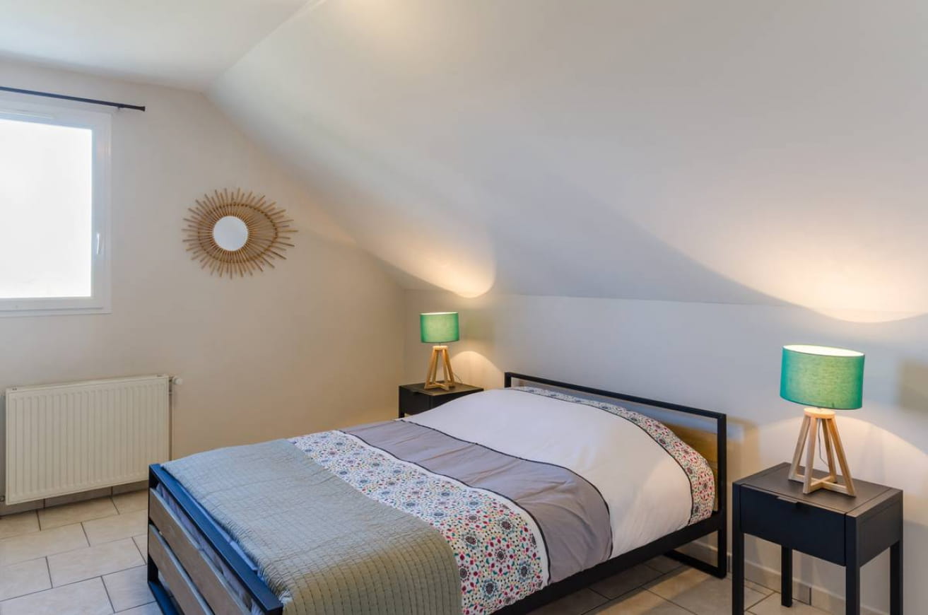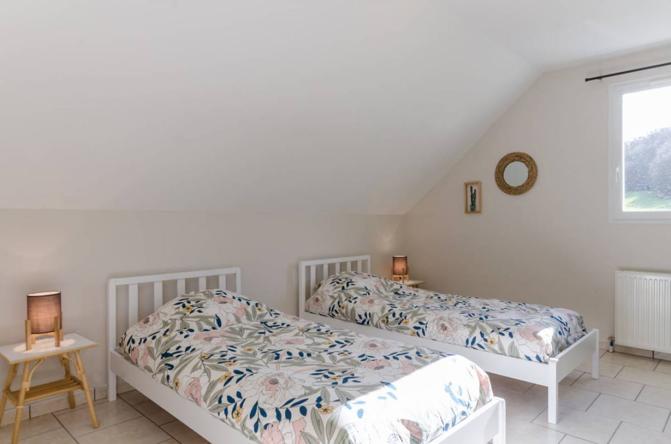 Begane grond: keuken, eetkamer/woonkamer, 1 slaapkamer toegankelijk voor mensen met een beperkte mobiliteit (1 eenpersoonsbed), badkamer met douche, wc. Boven: 2 slaapkamers met tweepersoonsbed (140×190) en 2 slaapkamers met 2 eenpersoonsbedden (90×190), 2 doucheruimtes, wc. Bijkomende kosten €18/dag voor gas en elektriciteit. Lakens €10/enkel bed €15/dubbel bed. Deze gîte is ontworpen om groepen te ontvangen voor seminars.