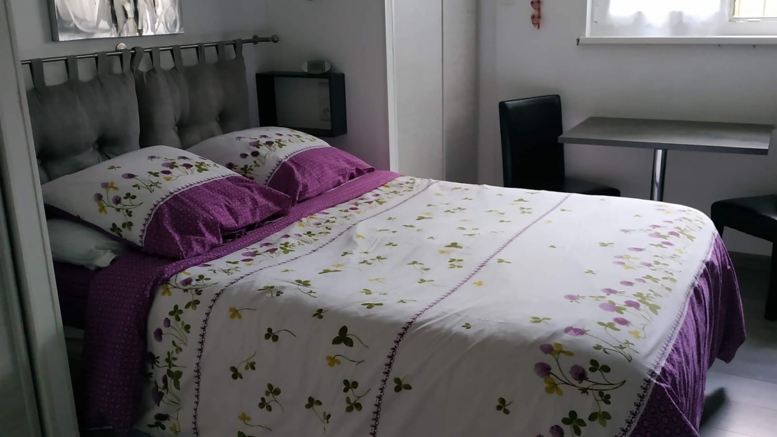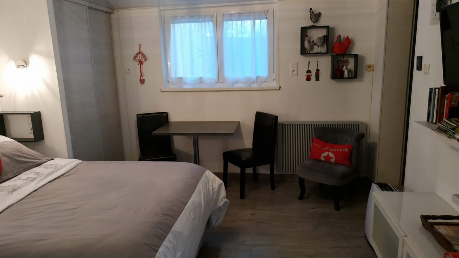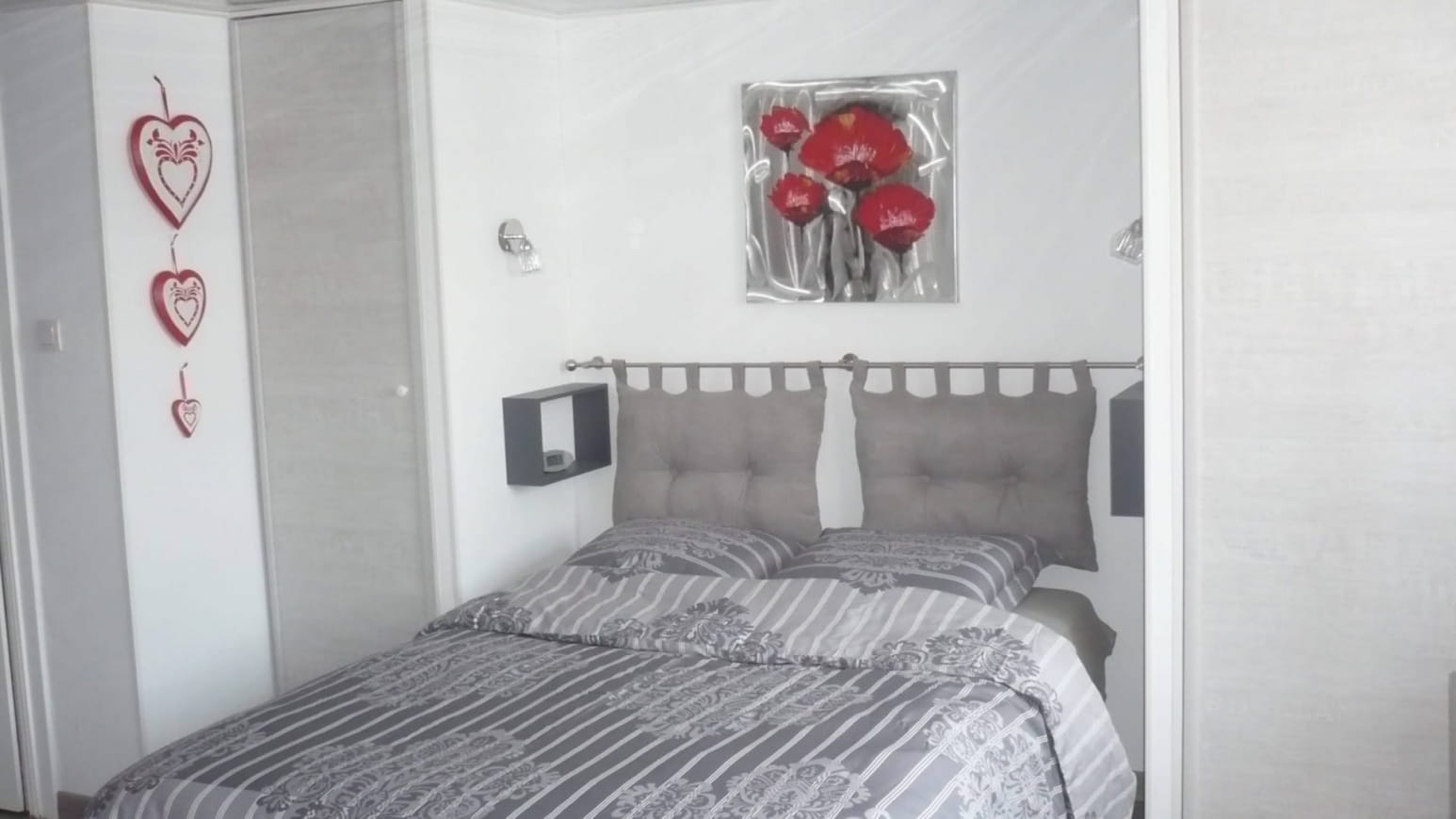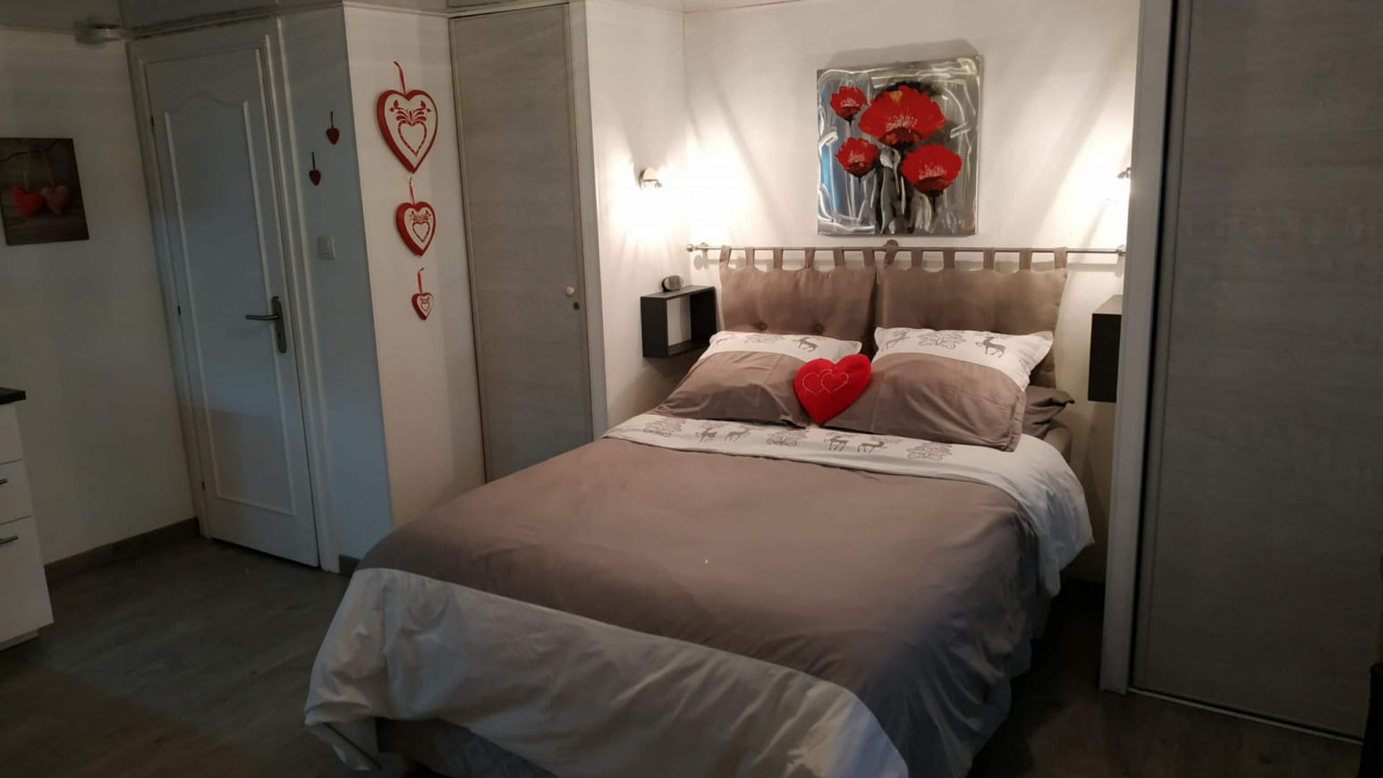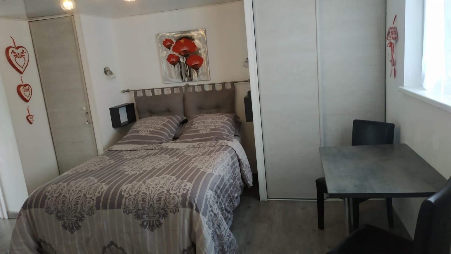 De oppervlakte van de gîte is 45 m2 , de slaapkamer heeft een bed met 2 matrassen op een bodem van 180 , elk met een eigen dekbed , veel bergruimte .