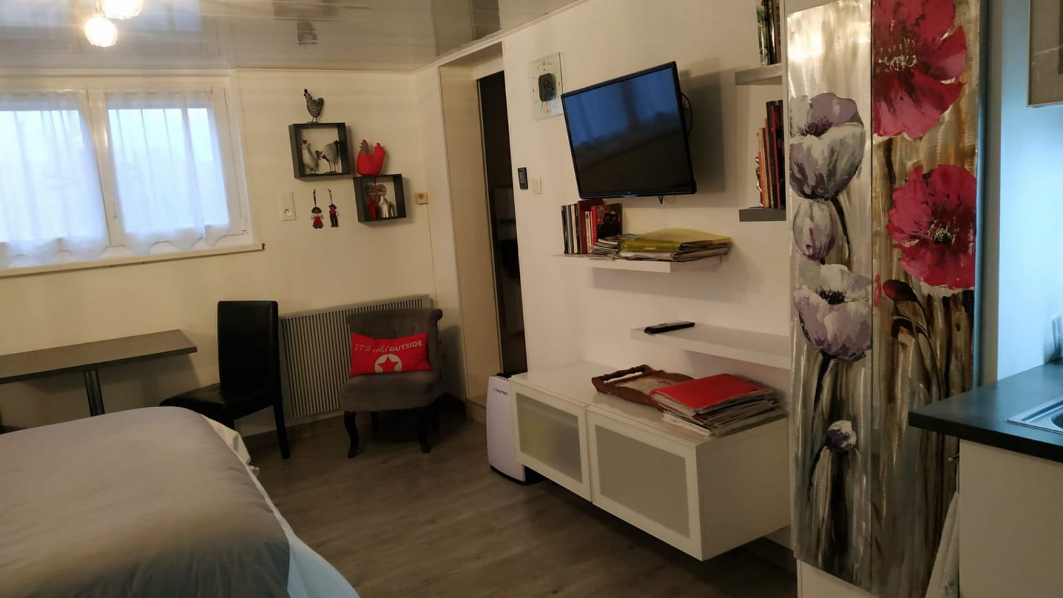 De studio, waarvan de ingang aan de andere kant van het huis is, is een eenpersoonskamer met een grote badkamer en bergruimte, totale oppervlakte 28 m2, bed 140 x 200, goed uitgeruste kitchenette, kasten, geschikt voor een of twee personen.