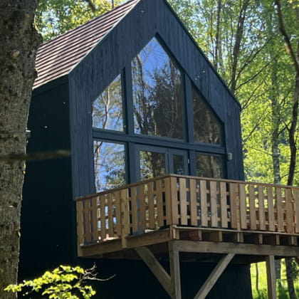 Korte termijn verhuur van 3 eigentijdse lodges op een zeer bebost terrein van ongeveer 2800 m2 met uitzicht op de bergen en het mooie dorpje Saint-Quirin.