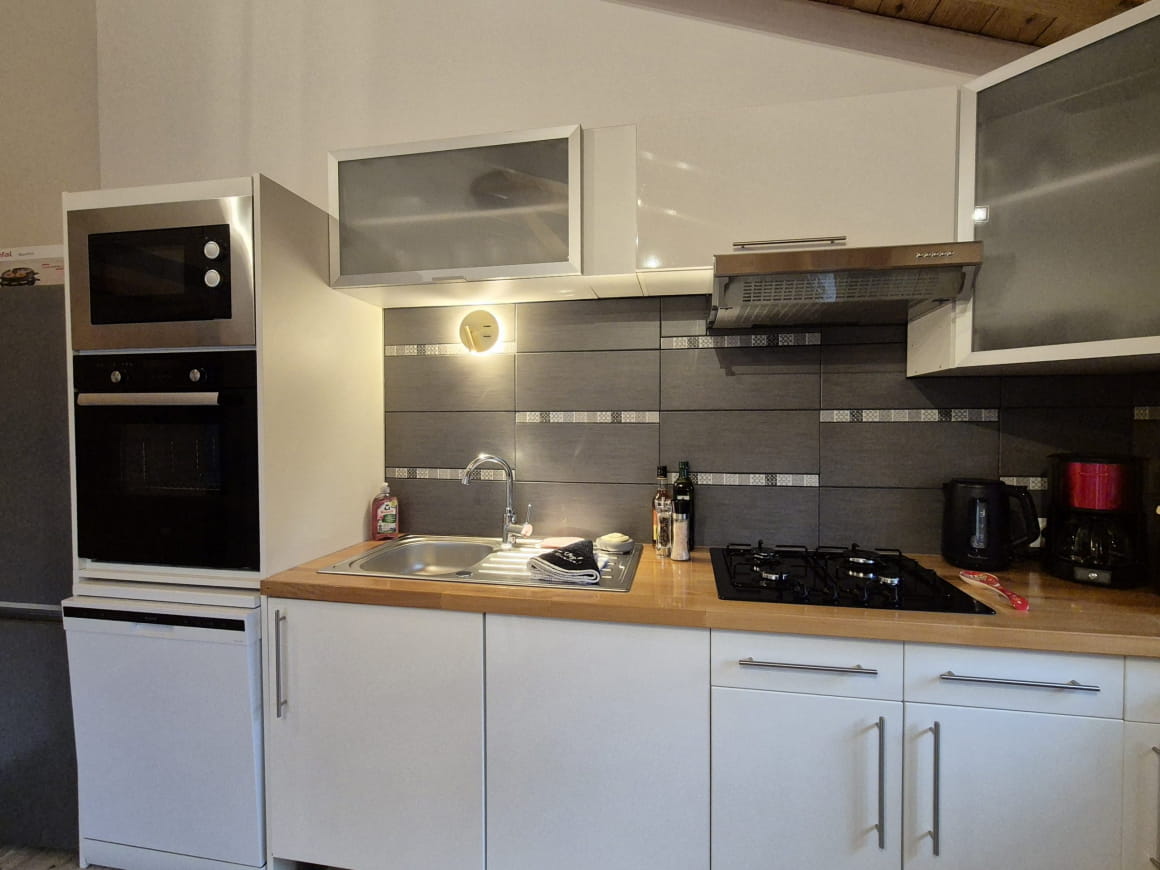 Binnen is alles ontworpen voor je comfort. De lichte woonkamer heeft een eethoek en een ontspanningsruimte met een flatscreen-tv (DTT-zenders en OCS-boeket), een pelletkachel voor gezellige avonden en een slaapbank. De volledig uitgeruste keuken heeft een vaatwasser, oven, koelkast, vriezer, Nespresso-apparaat, broodrooster en zelfs een raclette-apparaat voor gastronomische maaltijden. De 2 slaapkamers hebben ook beddengoed van topkwaliteit voor een goede nachtrust!