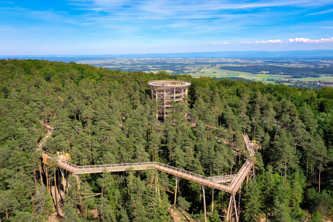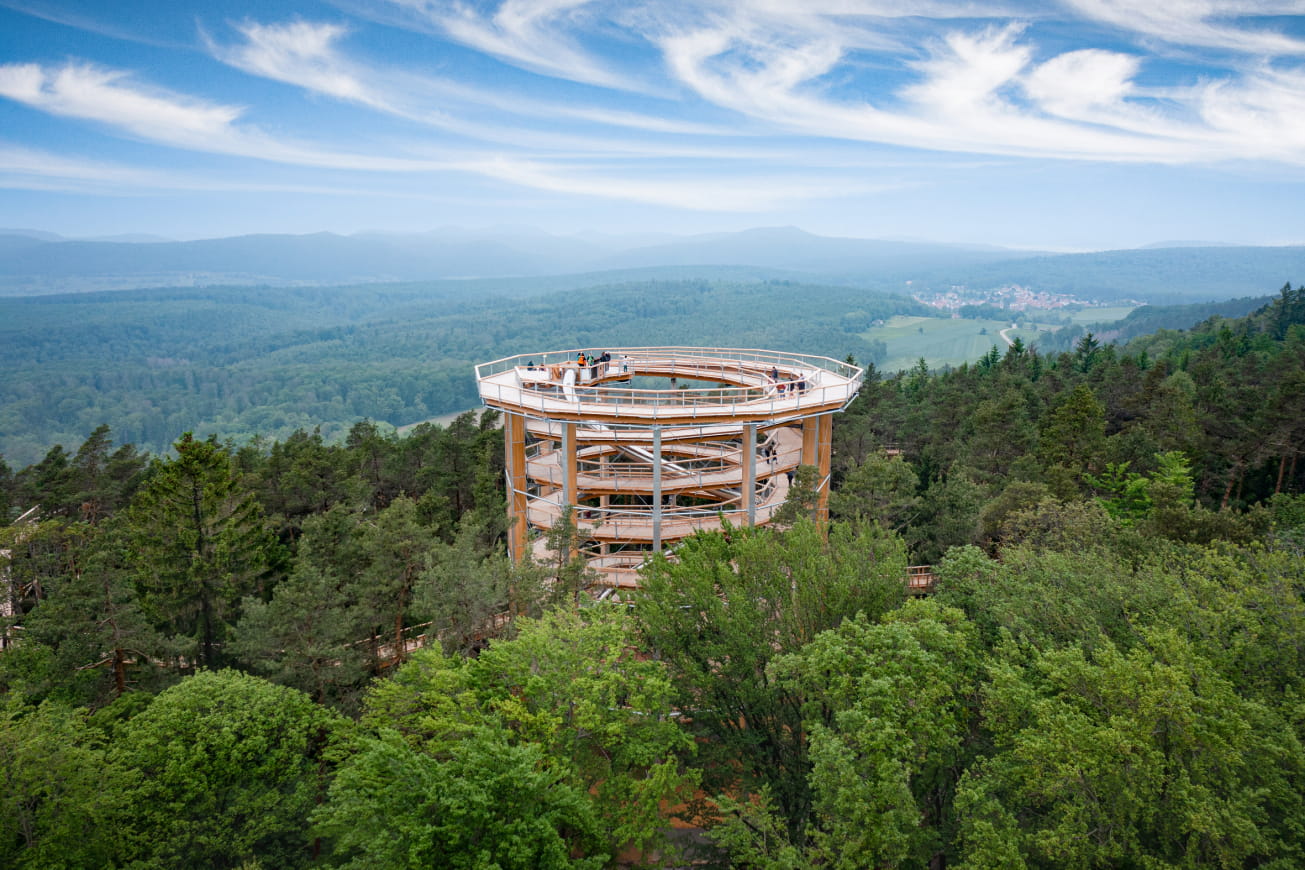 De Chemin des Cimes Alsace wacht op je in de bossen van het Regionale Natuurpark Vosges du Nord, vlakbij de Duitse grens, voor unieke ervaringen dicht bij de natuur. Dit bouwwerk, het enige in zijn soort in Frankrijk, bereikt een hoogte van 29 m en neemt je mee naar de boomtoppen om te genieten van een prachtig panoramisch uitzicht. Het Zwarte Woud, de Rijnvlakte en de noordelijke Vogezen zijn er allemaal om van te genieten in al hun pracht.