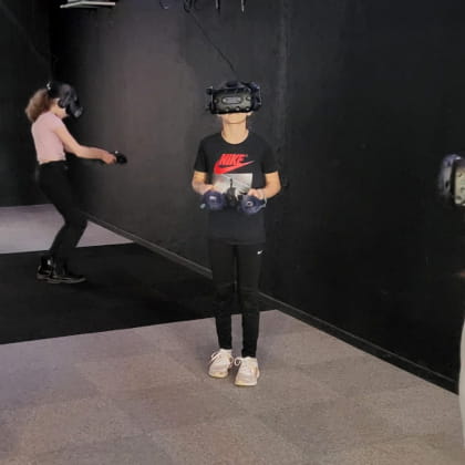 Nous proposons plusieurs escapes games en Réalité Virtuelle (Alice Tchenobyl Survival et plein d’autres ainsi des jeux et des experiences divers en Réalité Virtuelle (Voler Plonger Voyager etc…)à partir de 7ans nous avons 4 postes de Réalité Virtuelle
