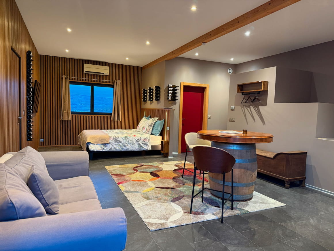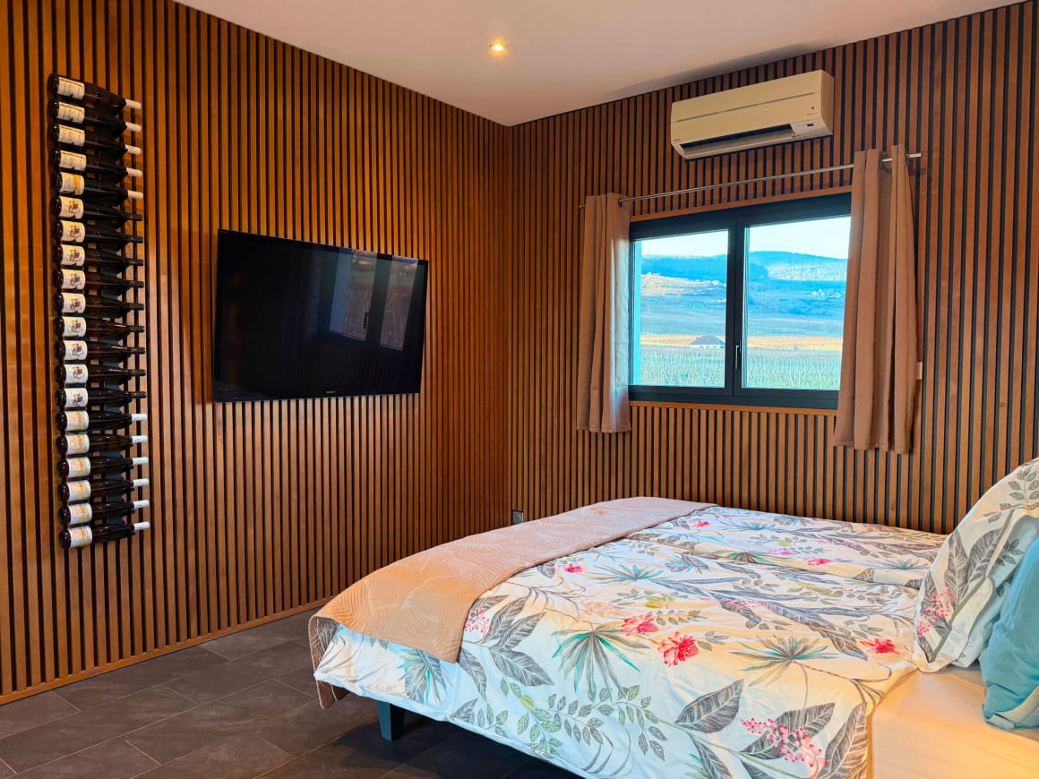 Dès votre arrivée, bénéficiez d’un accueil chaleureux dans la cave du domaine, et dégustez votre apéritif offert (vin, crémant ou jus de raisin bio). La suite L’Inattendue est équipée d’un lit king-size, d’une salle de bain moderne avec douche à l’italienne. Le matin, un petit-déjeuner gourmand concocté à base de produits locaux et de jus de raisin bio vous fera démarrer la journée du bon pied dans la cave du domaine. Profitez ensuite de votre balcon-terrasse privatif de 9 m² et de sa vue magnifique sur les montagnes et les vignes.