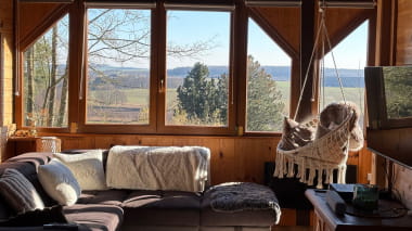 Chalet en lisière de forêt 3 étoiles dans une zone naturelle protégée au sein du parc régional des Vosges du Nord. (situé à 50 minutes de Strasbourg, 10 minutes de Kirrwiller) dans en écrin de verdure. Amoureux de la nature, profitez d’une pause détente et dépaysante au calme avec notre bain à remous* 6 places (*disponible de mai à septembre), d’une vue panoramique sur la vallée, les étoiles, et la forêt (depuis l’intérieur également). Nombreux oiseaux et biches à observer. L’essence même de notre gîte est la protection de la nature, l’écotourisme et de favoriser les circuits courts.