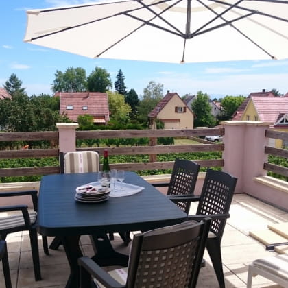 La pièce de vie donne sur une belle terrasse privative de 25m², totalement équipée en mobilier de plein air. Vous y passerez d’agréables moments à l’abri des regards indiscrets tout en observant les allées et venues des cigognes du nid voisin et par temps clair, vous distinguerez au loin les Alpes suisses.