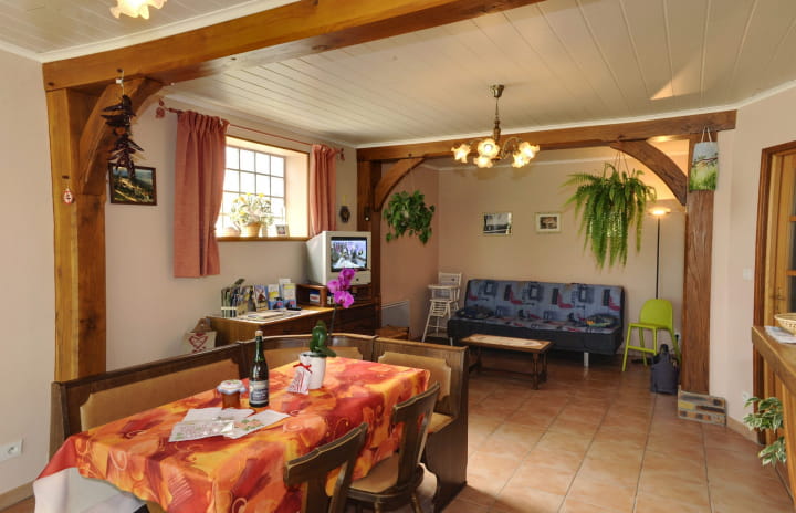 Salle à manger/séjour (36m²), cuisine américaine. Une chambre (1 lit double), une chambre (2 lits simples), salle d’eau, wc. Jeux extérieurs : but de foot, panneau de basket et table de ping pong, maisonnette, toboggan. Pour votre confort, les lits seront faits à votre arrivée. Internet. Charges supplémentaires : électricité et bois. Taxe de séjour en supplément : 0.60€/jour/personne (gratuit pour les mineurs).